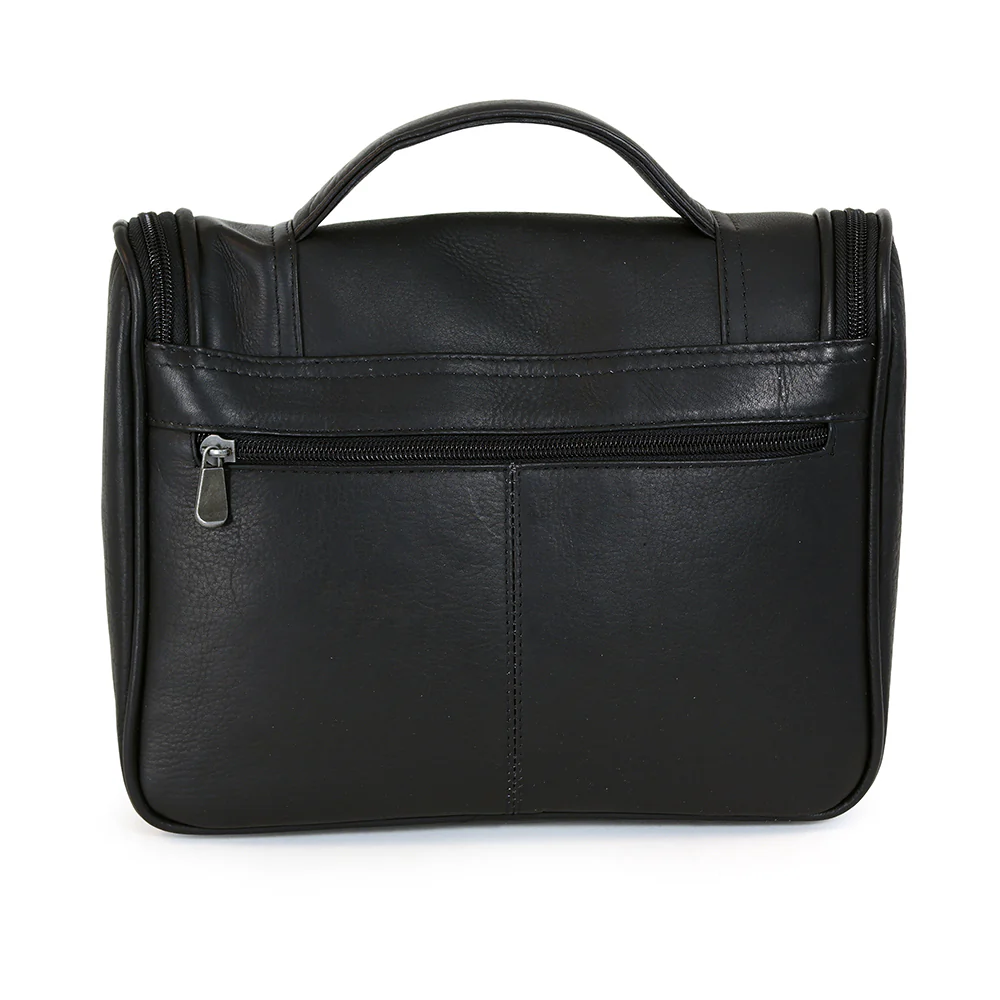 This luxurious leather toiletry kit conveniently hangs for easy access to all your travel essentials.