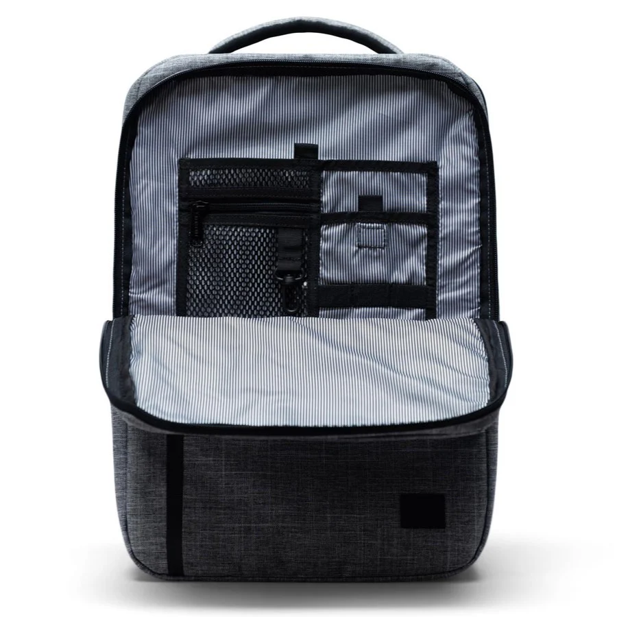 The Travel Backpack is a modern on-the-go style intended for tech-savvy journeys. Featuring a convenient luggage trolley sleeve, three main compartments are outfitted with a variety for organizers for devices and in-flight essentials.