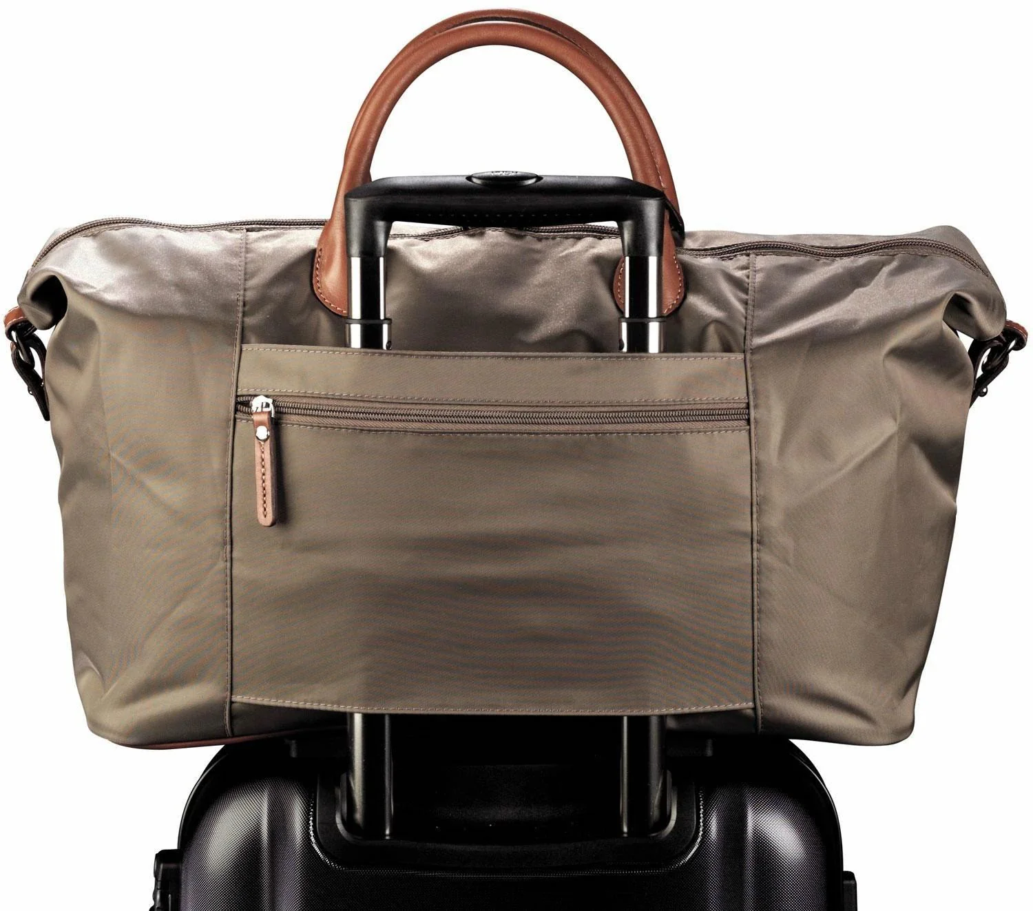 - Lightweight, color-rich twill nylon is trimmed with top-grain leather and lined with smooth polyester fabric.