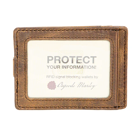 Lined in material that blocks against radio frequency ID theft. One side has a window pocket, the other side has two card slots and a leather covered spring steel money clip. Distressed Brown.