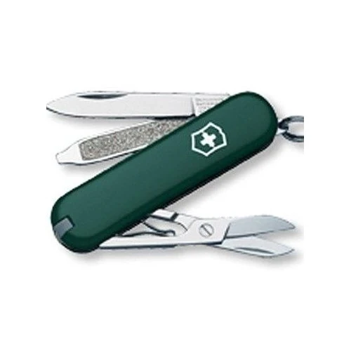 Stainless steel tools: small blade, nail file + screwdriver tip, scissors, toothpick, tweezers, and key ring. Available in Cobalt Blue, Red, Yellow, Hunter Green, and Black.