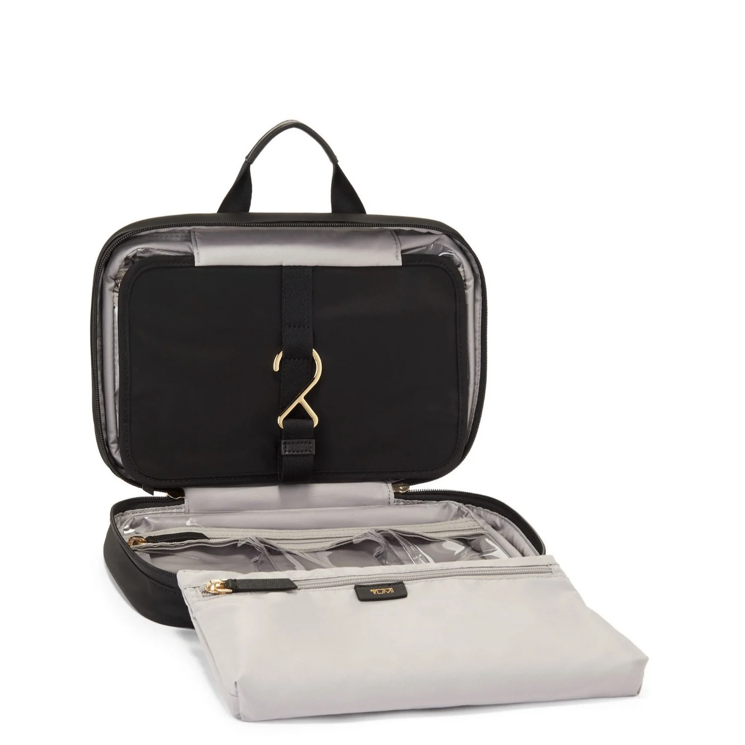 Don’t leave home without this travel-ready style. Three transparent interior compartments and a detachable pouch create optimal organization. Lay it flat or hang from a fixture when open.